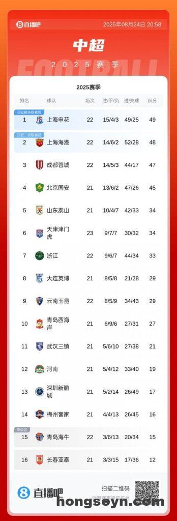 直播吧08月24日讯 中超第22轮结束一场关键较量,上海海港主场1-1战平天津津门虎,在中超积分榜上以48分排名第2,落后榜首申花1分。