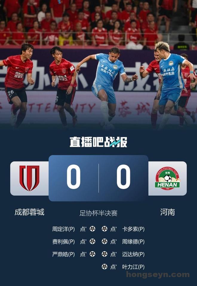 直播吧8月19日讯 北京时间8月19日19:35,足协杯半决赛,成都蓉城在五粮液体育文化中心体育场迎战河南队。上半场,阿奇姆彭奔袭后抽射中柱,马亚铲倒费利佩染黄;下半场,马亚头球中柱,王国明补时精彩两连扑。双方战成0-0平进入加时赛,加时赛30分钟两队仍未破门,比赛通过点球决胜。点球大战,罗慕洛、马亚失点,王国明扑出莱切特点球。最终,河南队4-3击败蓉城,率先闯入足协杯决赛。