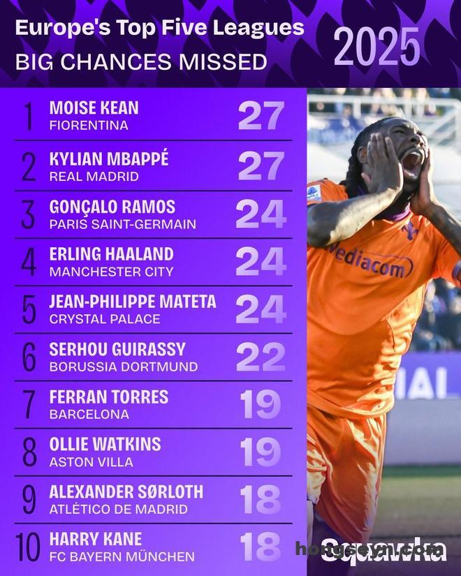 北京时间1月1日,知名数据机构Squawka统计出了2025年欧洲五大联赛错失绝佳机会次数最多的10名球员,莫伊塞-基恩和姆巴佩同以27次并列第一,哈兰德24次并列第二,哈里-凯恩上榜。