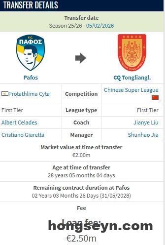 德转显示,重庆铜梁龙新援迪马塔的租借费为250万欧。