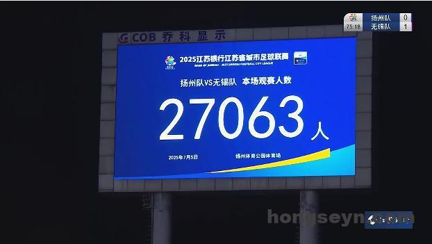 直播吧07月05日讯 江苏联第6轮,扬州队vs无锡队。现场广播宣布,共有27063名球迷现场观看本场比赛。