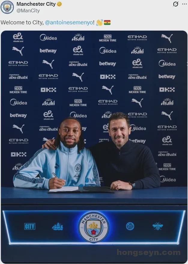 官方:曼城宣布从伯恩茅斯签下了塞梅约,这名边锋签下了一份为期五年半的合同。