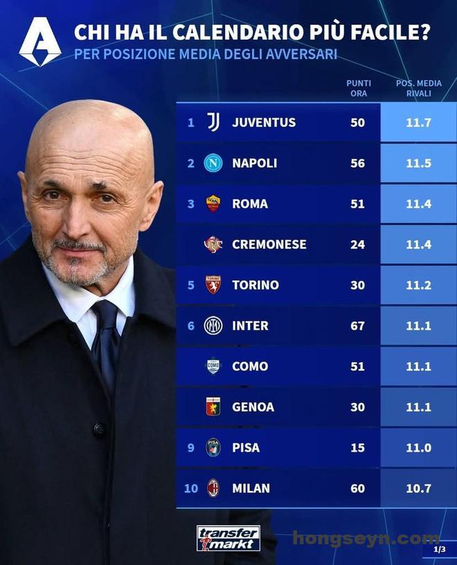北京时间3月11日,德转统计出了本赛季意甲剩余10轮各支球队将会遭遇的对手在联赛中的平均排名,其中尤文图斯的最后10个对手目前平均排名第11.7位,为所有球队最低。目前7分优势领跑积分榜的国际米兰最后10轮对手的平均排名则为11.1位。