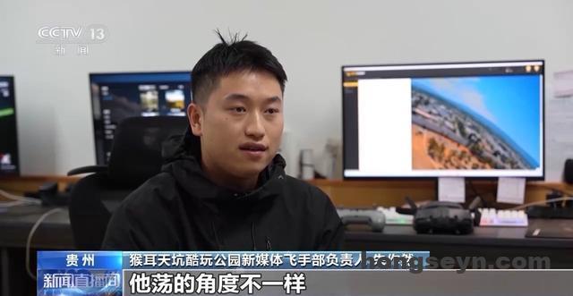 猴耳天坑酷玩公园新媒体飞手部负责人 朱作然:要有基本的审美构图,因为每个客人的体重不一样,荡的角度也不一样,他的摆幅也不一样。所以我们就需要客人的动作或者说天气和光线,改变我们的轨迹。