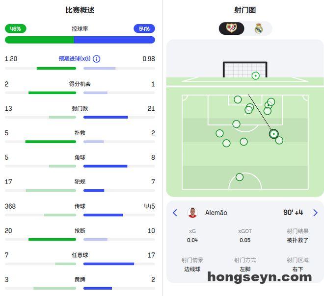 从统计数据可以看到,巴列卡诺的预期进球是1.2比0.98领先皇马,绝佳得分机会也比皇马多1次。