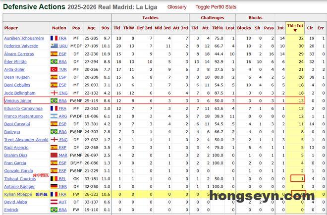 另外还有一个数据,就是姆巴佩本赛季西甲前11轮踢完后,他的抢断和拦截数据依旧是0。要知道哪怕是皇马的门将库尔图瓦,都比姆巴佩多贡献了1次抢断。皇马全队只有3人攻防数据贡献为0,其他两位是出场54分钟的阿拉巴和出场不到10分钟的恩德里克。
