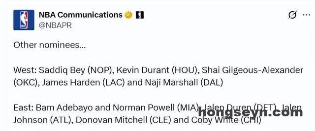 西部:萨迪克-贝(鹈鹕)、杜兰特(火箭)、亚历山大(雷霆)、哈登(快船)、马绍尔(独行侠)