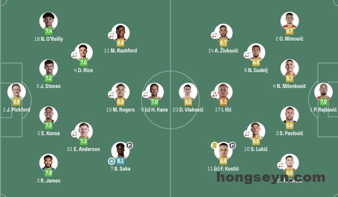 英格兰(4231):1-皮克福德;3-里斯-詹姆斯,2-孔萨,5-斯通斯,18-奥赖利;4-赖斯(65‘8-亨德森),21-安德森;7-萨卡,15-罗杰斯(65‘10-贝林厄姆),11-拉什福德(64‘19-埃泽);9-凯恩(65‘17-福登)