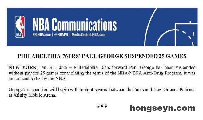 北京时间2月1日,NBA官宣重磅罚单,76人核心之一的乔治因违反联盟禁药政策,被禁赛25场比赛,他将直接损失1174万美元薪水。乔治本人发布声明向76人和球迷道歉,并且表示是寻求治疗过程中“误服不当药物”。